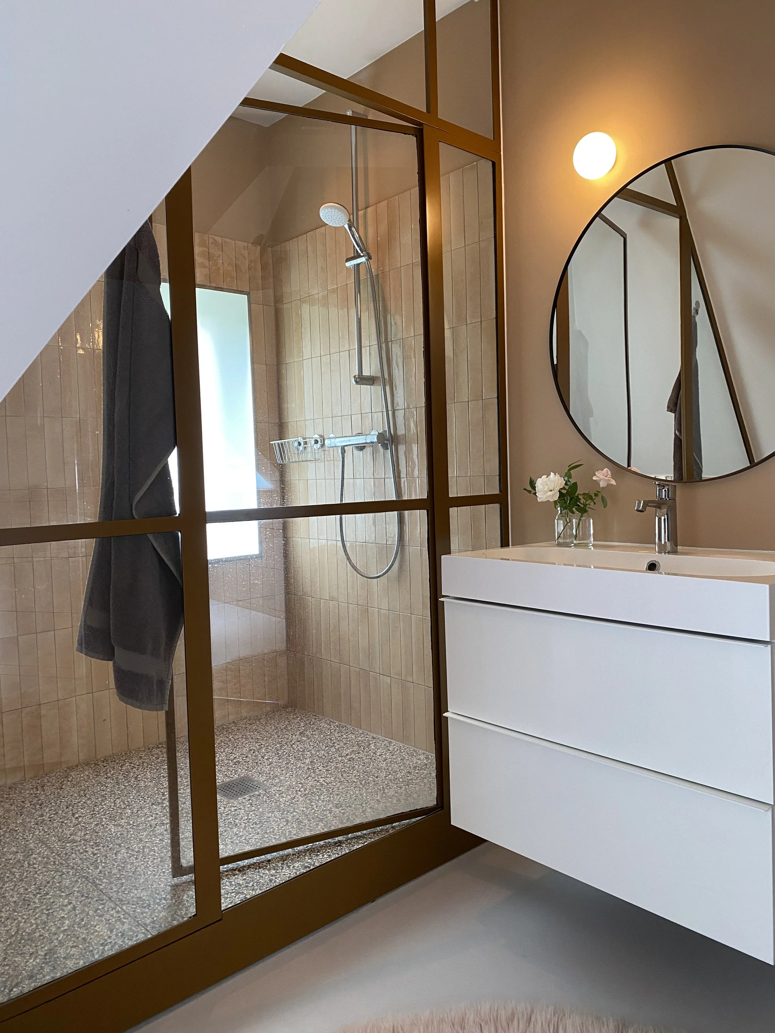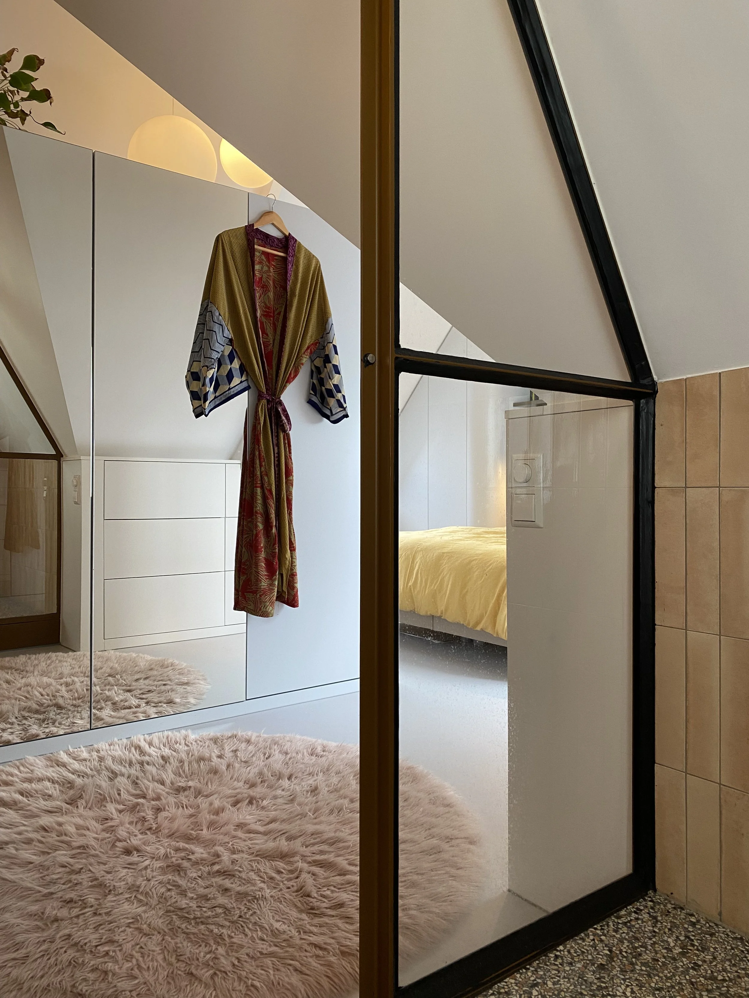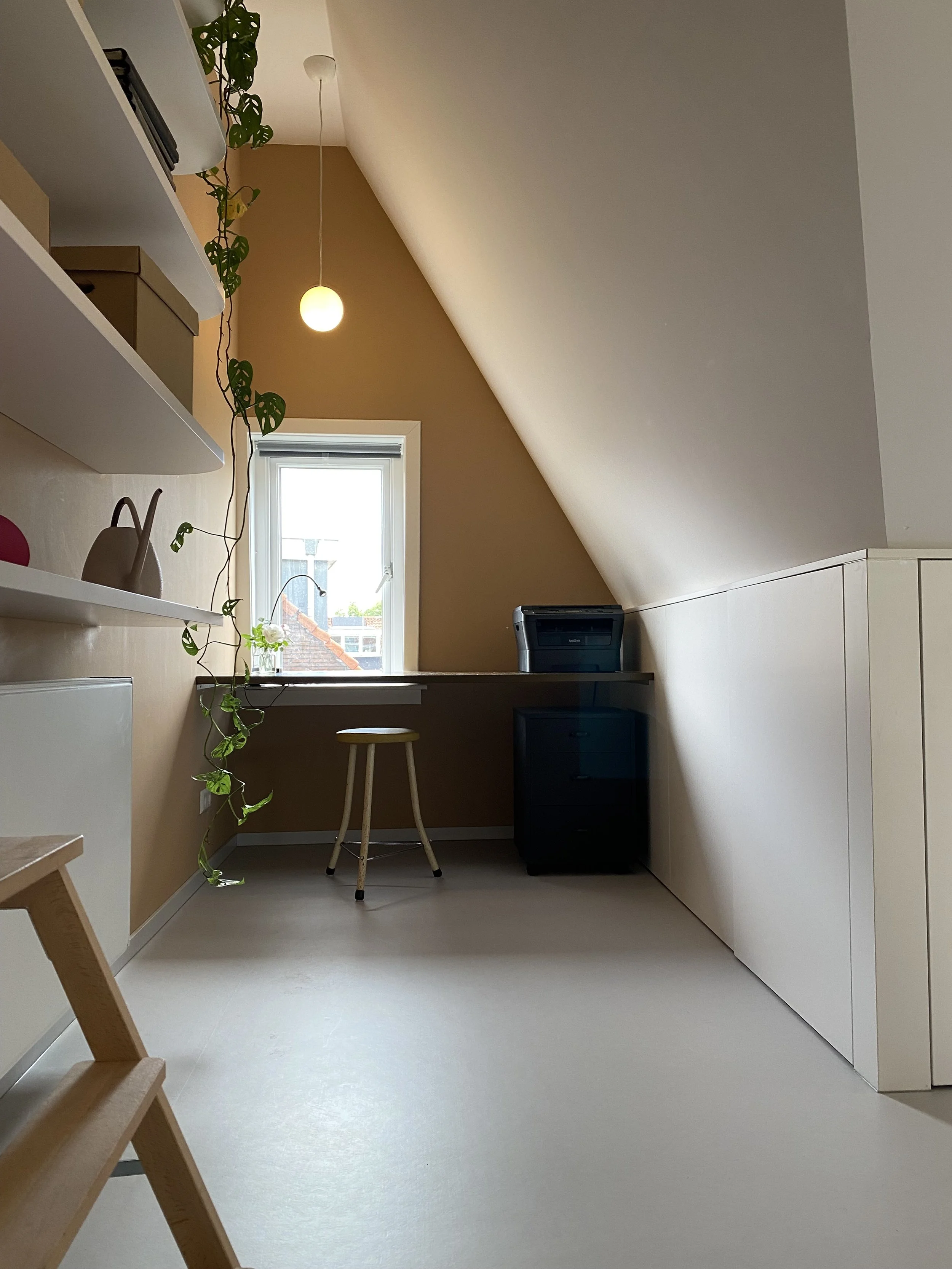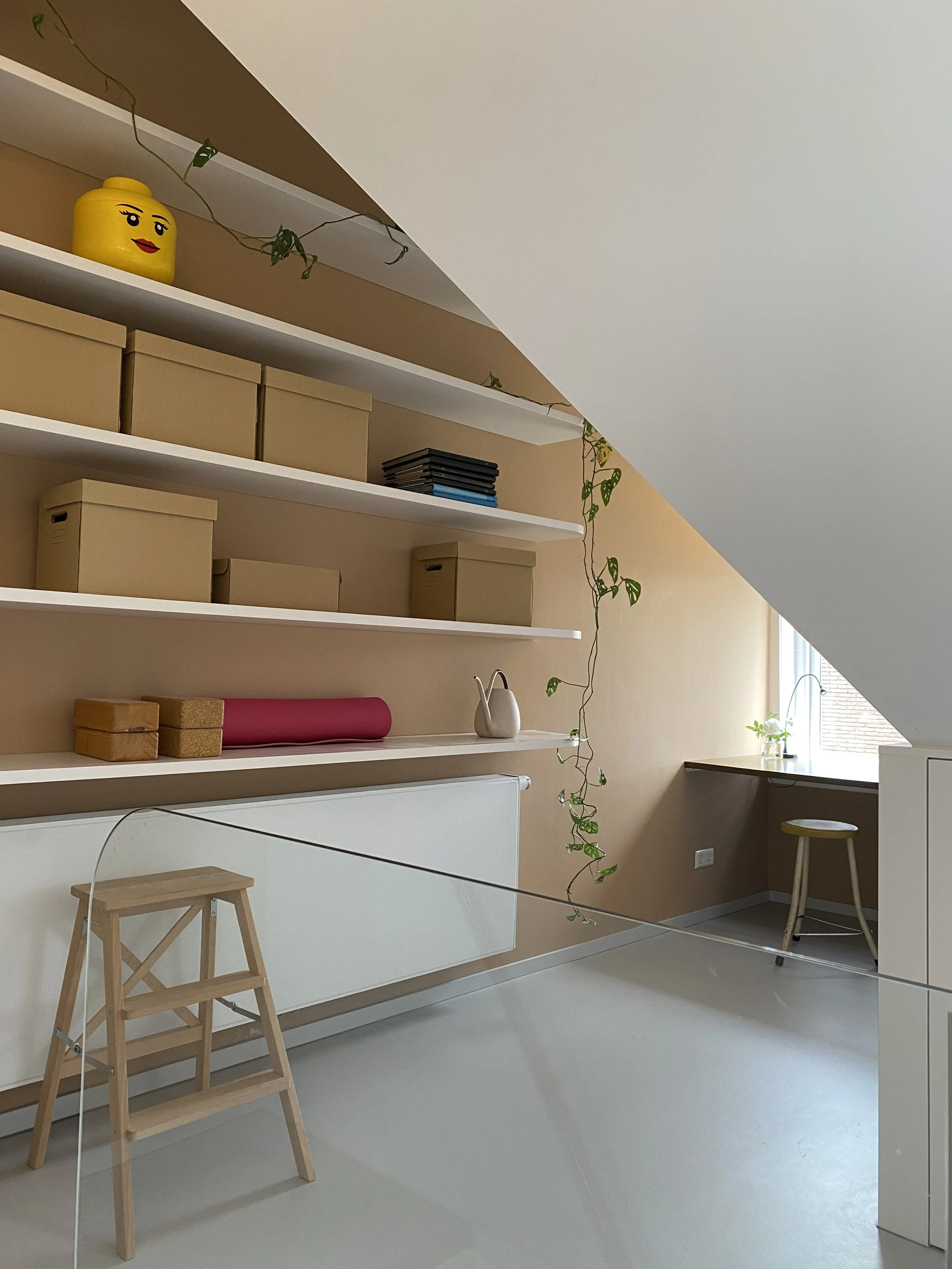Zo begon de grote ingreep op een etage die nogal eens het onderspit delft in de rangorde van aandacht en investering, de zolder. Randvoorwaarden: warm, werken, slapen, privé ruimte, yoga en eigen badkamer. En! De kwaliteit van deze bijzonder T-vormige ruimte behouden.